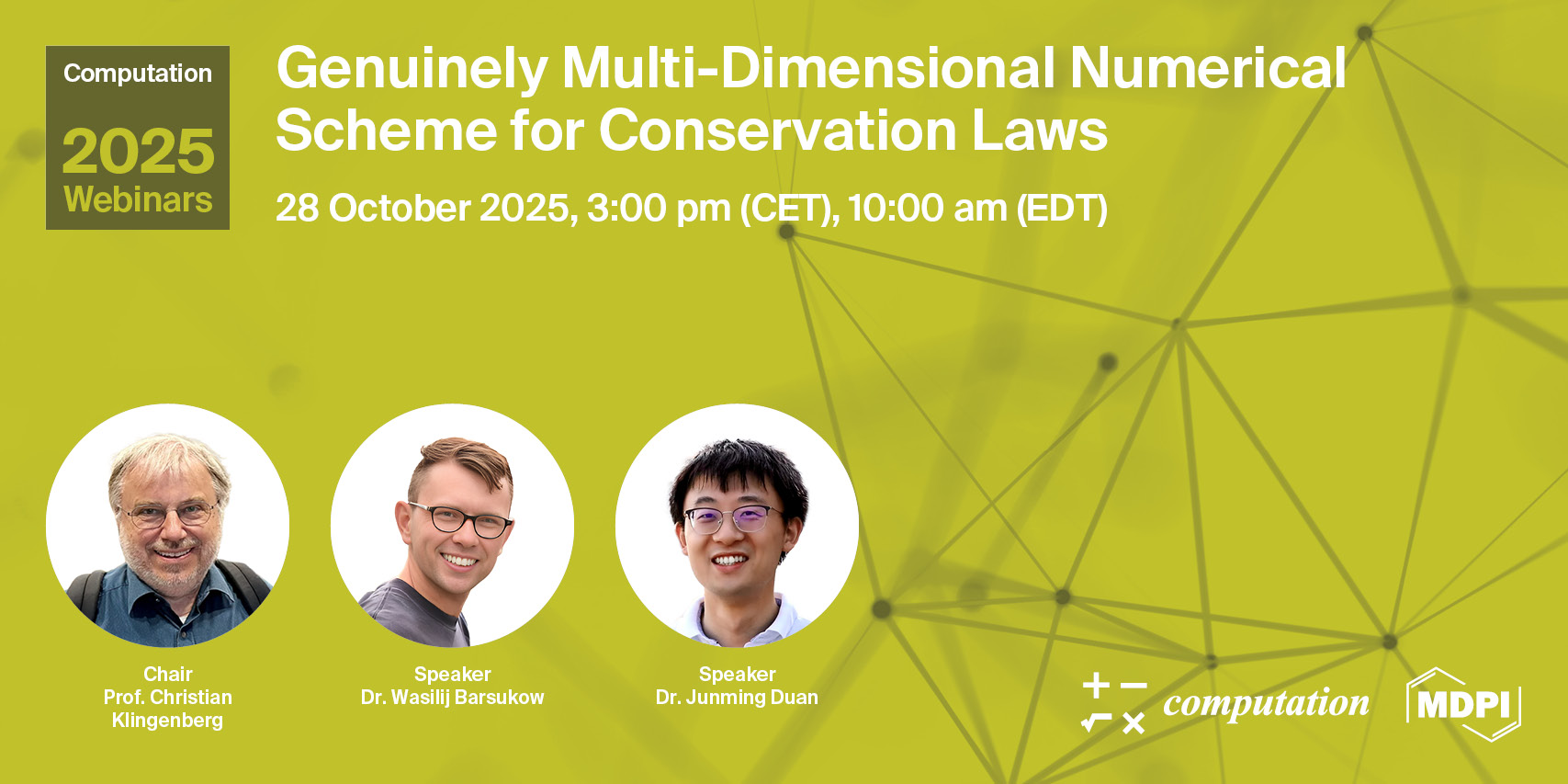 - Computation Webinar: Genuinely Multi-Dimensional Numerical Scheme for Conservation Laws • online • Oct 28, 2025 • Talk: On An Asymptotic-Preserving Active Flux Scheme [more]